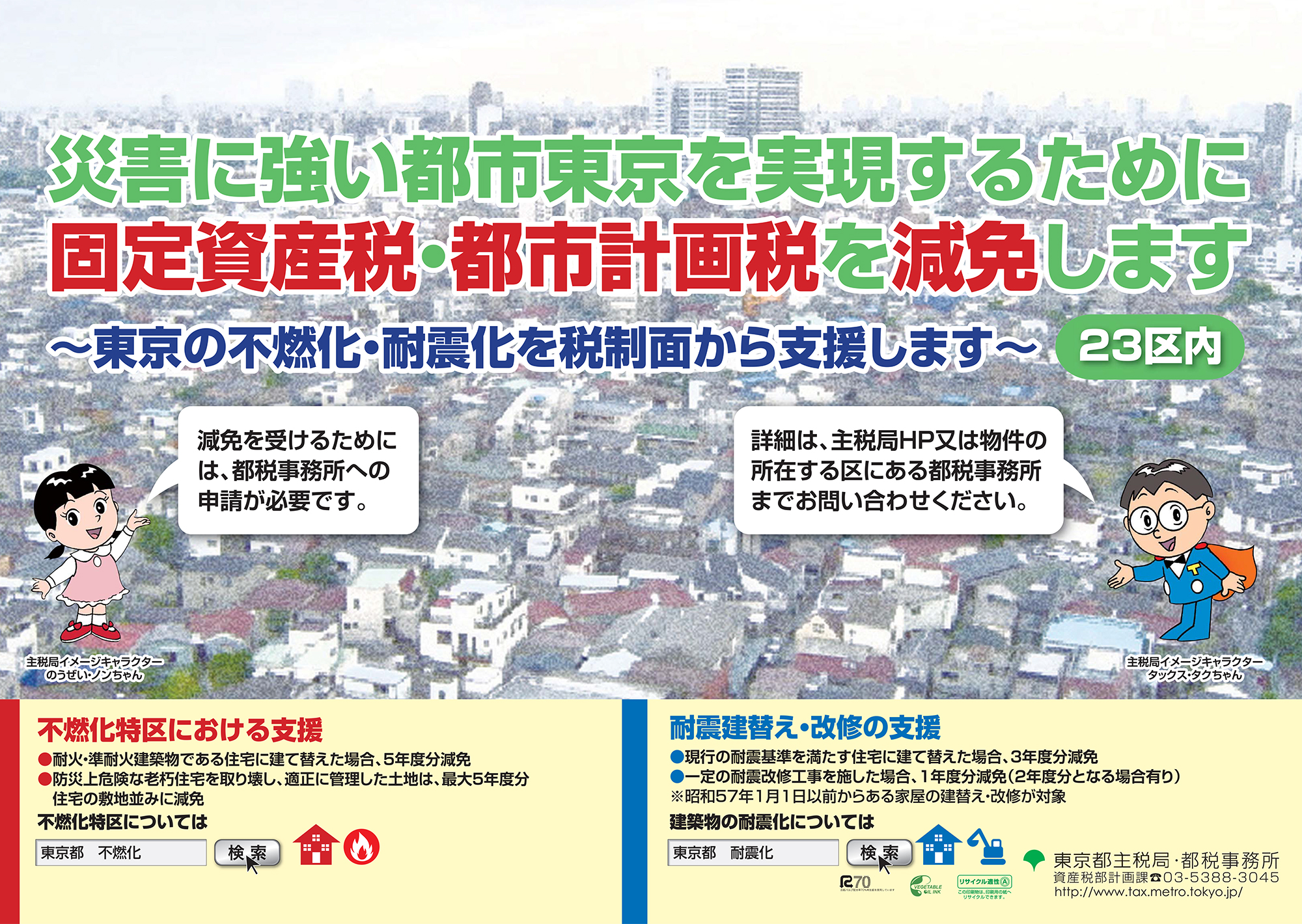 災害に強い都市東京を実現するために固定資産税・都市計画税を減免します。(23区内)