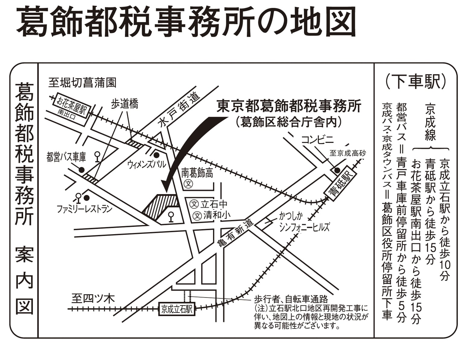 京成線:京成立石駅から徒歩10分、青砥駅から徒歩15分、お花茶屋駅南出口から徒歩15分