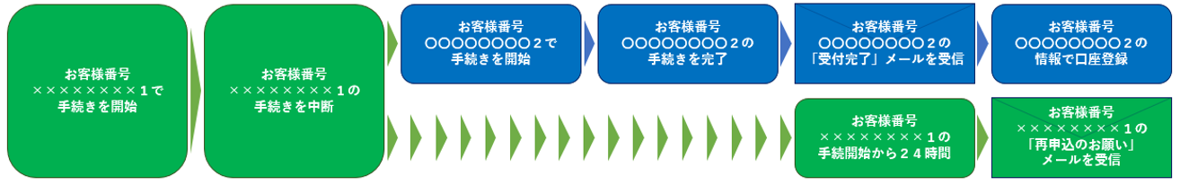 その場合、それぞれのメール記載のお客様番号が異なりますので、ご確認をお願いいたします。口座の登録は、「受付完了」メールが届いたお客様番号で入力いただいた情報により行われます。
